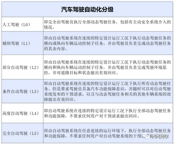 自动驾驶有着明确的等级划分,据中国软件评测中心智能网联汽车测评工程技术中心总工程师王伟介绍,2014年,SAEInternational(国际汽车工程师协会)发布了“SAEJ3016TM标准道路机动车驾驶自动化系统分类和定义”(以下简称“标准”),并于2018年6月对标准进行了修订更新。标准将自动驾驶分为L0-L5共6个级别。