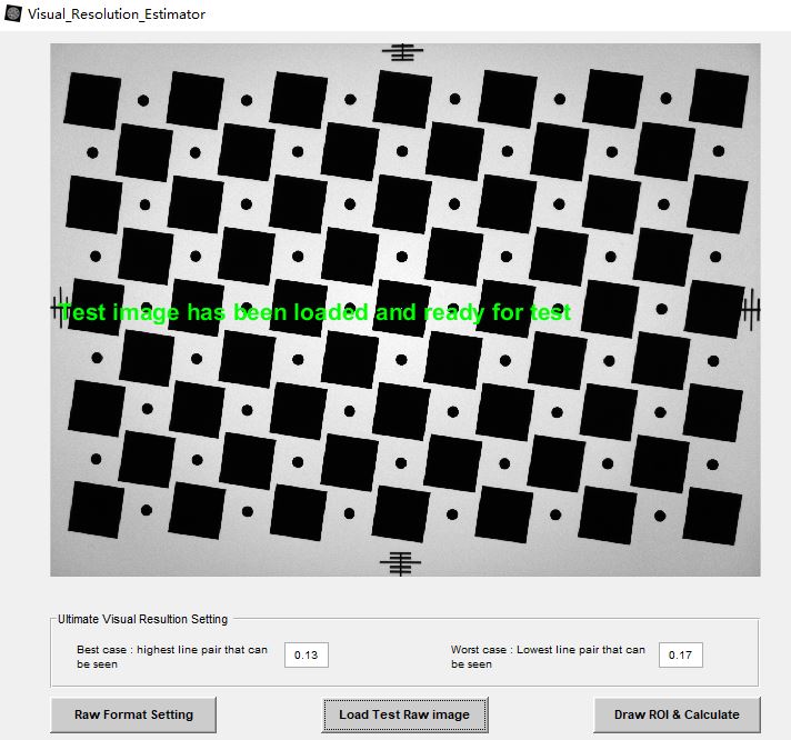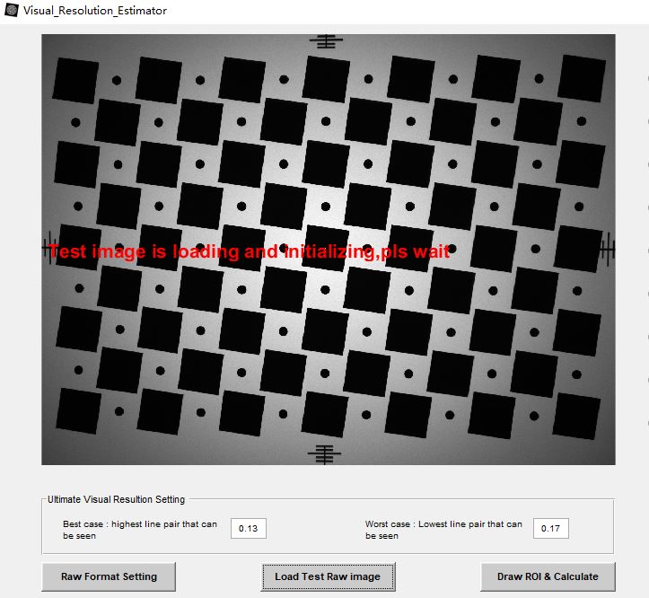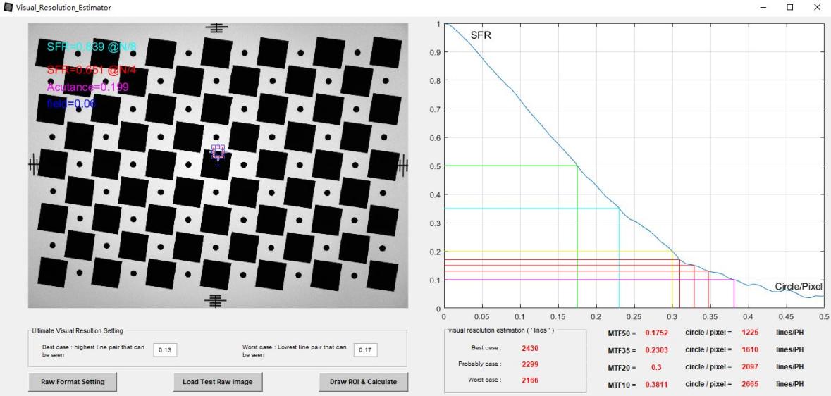 第二步,点击“Load Test Raw Image”,选择要测试的raw图,然后等待一小会直到图中显示绿色的提示为止。(图中ultimate visual resolution setting即为模拟不同人主观可接受清晰度响应情况的响应值,不更改的情况下采用推荐的默认值)。如下图: